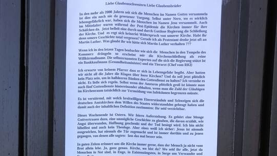 Darin empört er sich über die wegen der Corona-Krise erlassenen Kirchenschließungen und den fehlenden Gottesdienst. „Hatten wir nicht alle die Jahre Klagen über leere Kirchen? Und da soll jetzt plötzlich kein Platz sein, um (...) den Gottesdienst abzuhalten?“, wundert sich der anonyme Schreiber. Die Kirche würde gerade in der Krise ihre Schäfchen im Stich lassen, lautet der Vorwurf.
