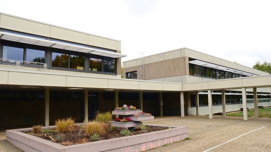 Die im Jahr 1906 erbaute Schule an der Gartenstraße, dem heutigen Rathaus, war längst zu klein. So wurde schließlich an sieben Standorten Unterricht erteilt. Darunter waren zwei neuerbaute Pavillons unweit des Schulgebäudes, der Sitzungssaal des alten Rathauses an der Nußbaumstraße, der evangelische Gemeindesaal, der katholische Gemeindesaal, das Bonhoeffer-Gemeindezentrum und das Clubhaus des Kraftsportvereins.Schwierig für den damaligen Gemeinderat war es einen Schulstandort zu finden. Nach jahrelangem Suchen fand man ihn mitten im Hochwald des Walddistrikts „Winterrain“. Den anschließend durchgeführten Architekten-Wettbewerb gewann das Architektur-Büro Schmechel aus Mannheim, das dann die Planung und Bauleitung durchführte.