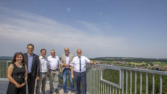 Schömberg. Laute Schüsse hallen durch den Wald, als sich die Gruppe mit rund 50 Personen vom Parkplatz am Kurhaus in Richtung des neuen Aussichtsturms „Himmelsglück“ in Bewegung setzt. Auf der „Augenblick“-Runde geht es durch den Wald hinter dem Kurpark zum Turm. Der Schützenverein Oberlengenhardt, dessen Mitglieder sich oben auf dem Turm positioniert haben, macht lautstark auf die offizielle Eröffnung an diesem Freitagmorgen aufmerksam.