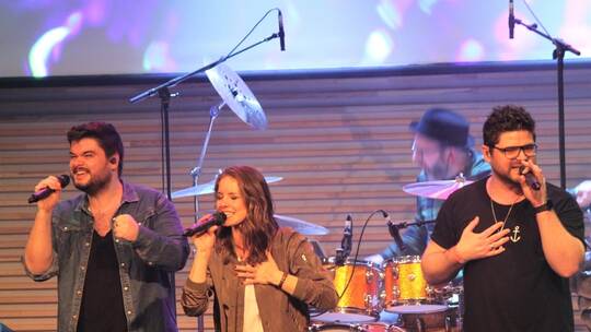 Moderator Andi Jägers leitete zu der Band über, die jungen Gottesdienstbesuchern keine Unbekannte ist. Mit einer Tanzeinlage kommen die „Könige und Priester“-Sänger Florence Joy, ihr Ehemann Thomas Enns, mit dem sie vier Kinder hat, und sein Bruder Jonathan Enns auf die Bühne, gemeinsam mit den Musikern Johannes Schmidt (E-Gitarre), Olli „OZ“ Schmitz (Schlagzeug) und Semjon Becker (Bass). Die Enns-Brüder hatten es bereits in die Finalshows von „Deutschland sucht den Superstar“ geschafft. Die 31-jährige Florence Joy ist auch bei Gospelprojekten und als Schauspielerin aktiv: „Es gibt nichts Schöneres, als von der Liebe zu singen. Und Gott ist die Liebe.“