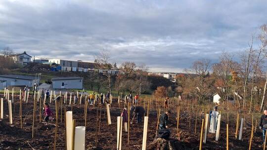 Birkenfeld. 40 Familien und Kinder pflanzen an den Tennisplätzen in Gräfenhausen 500 junge Bäumchen. Vertrocknete und abgestorbene Buchen und Kiefern waren auf der jetzt wieder aufgeforsteten Fläche gerodet worden. Dass dort wieder frisches Grün sprießt, ist unter anderem dem Pforzheimer Privatspender Jost Brunner zu verdanken, der mit seiner Enkelin vor Ort anpackt. Rund 300 neue Elsbeeren und Eichen wurden gesetzt, die gut mit Trockenheit zurechtkommen und wertvolle Lebensräume für heimische Tiere bieten.