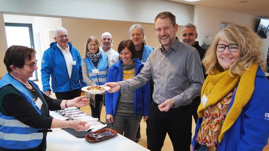 Remchingen. Ein Teller nach dem anderen wird über die Theke gereicht. Das Essen darauf ist noch ganz warm, die Stimmung im Wilferdinger Gemeindehaus gelöst, die Atmosphäre locker, als dort am frühen Sonntagmittag nach einem Gottesdienst der Startschuss für die Vesperkirche fällt. Organisiert von der Remchinger Diakoniestation und unterstützt von den drei evangelischen Kirchengemeinden und der Kommune, findet sie dieses Jahr zum ersten Mal statt. Noch bis Freitag gibt es im Wilferdinger Gemeindehaus ein warmes Mittagessen für einen symbolischen Preis von einem Euro, zudem kostenlos Getränke, Kaffee und Kuchen.