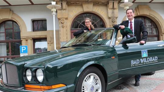 Der Bentley wurde eigens für die Aktion mit Bad-Wildbad-Werbung beklebt und soll hauptsächlich zwischen Sommerberg und Innenstadt als Shuttle verkehren. Der Besitzer des Fahrzeugs, der Sindelfinger Horst Thome, hatte in der PZ von den Britischen Wochen in Bad Wildbad erfahren und stellte sein Schmuckstück spontan zur Verfügung. Er nahm Kontakt mit Touristik-Chefin Stefanie Dickgiesser auf, die schnell alle notwendigen Schritte in die Wege leitete. Damit der Bentley auch eine Straßenzulassung bekommt, schaltete sich sogar der Calwer Landrat Helmut Riegger ein, der unbürokratisch auf dem kleinen Dienstweg ein CW-Kennzeichen für das Luxus-Cabriolet organisierte.