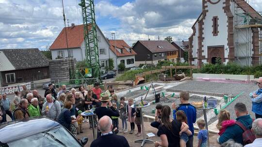 Schömberg-Bieselsberg. Bieselsberg kommt seinem neuen Gemeindehaus immer näher. An diesem Wochenende stand nun die Grundsteinlegung auf dem Plan. Ganz so schnell wie noch beim Spatenstich gedacht, wird das Gebäude neben der Kirche aber dann wahrscheinlich doch nicht fertig. Immerhin biegt das Großprojekt nun auf die Zielgerade ein, woran die Verantwortlichen zwischenzeitlich nicht mehr geglaubt haben. Die Freude war am Sonntag nach dem Familiengottesdienst dafür umso größer.