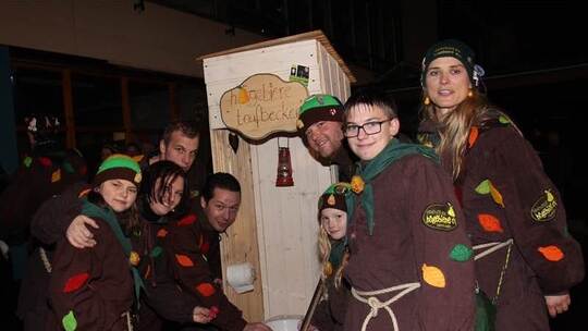 Der strömende Regen konnte den Birkenfelder Hogebieren und Freunden nichts anhaben. Die Narren ließen es beim achten Häsabstauben auf dem Schulhof der Ludwig-Uhland-Schule in Birkenfeld trotzdem krachen. Über 200 Gäste hatten sich versammelt, um die Fasnet einzuläuten und der Taufe von sieben neuen Häs- und Maskenträgern beizuwohnen. Unter ihnen befand sich auch der Birkenfelder Gemeinderat Andreas Weizenhöfer, der sich zusammen mit Lars Rupp, Kevin Ziegler, Sascha und Susanne Thome sowie den jüngsten Neuzugängen, den Schwestern Svenja (9) und Sophia Thome (7), um das WC-Taufbecken aufstellte.