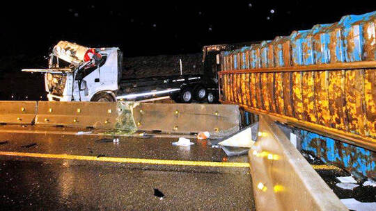 Am Dienstag um 20.05 Uhr war der Niederländer seinem Lkw mit Anhänger in Fahrtrichtung Stuttgart im Baustellenbereich unterwegs. Weil er zu schnell in einer Verschwenkung fuhr, dabei den Richtungswechsel und die abfallende Fahrbahn nicht mehr bewältigen konnte, löste sich ein Container mit Aluschrott vom Lastwagen. Der Container schlug beim Verlassen der Ladefläche gegen das Führerhaus und drückte das Dach nahezu bis auf die Höhe des Lenkrades ein. Anschließend schleuderte er gegen die Betongleitwände in der Mitte der Fahrbahnen und riss diese teilweise auseinander.