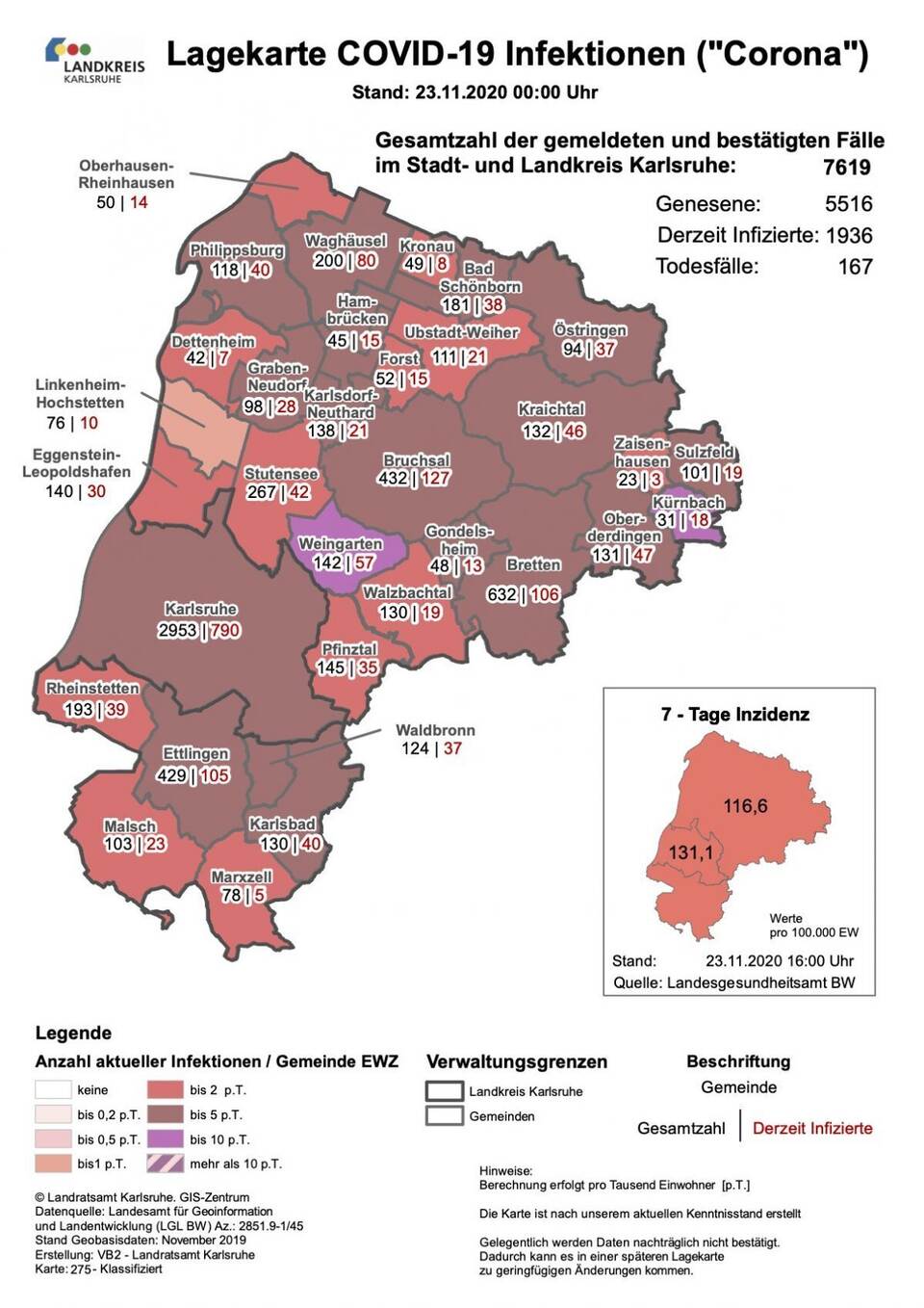 Das für den Land- und Stadtkreis Karlsruhe zuständige Gesundheitsamt vermeldet an diesem Montag 1936 Corona-Akutfälle, insgesamt gab es dort seit Beginn der Pandemie 7619 bestätigte Coronafälle. Dem Tagesbericht ist außerdem zu entnehmen, dass derzeit 5516 Personen wieder als genesen gelten und bereits 167 Personen den Kampf gegen Corona verloren haben (Stand: 23. November, 0 Uhr).