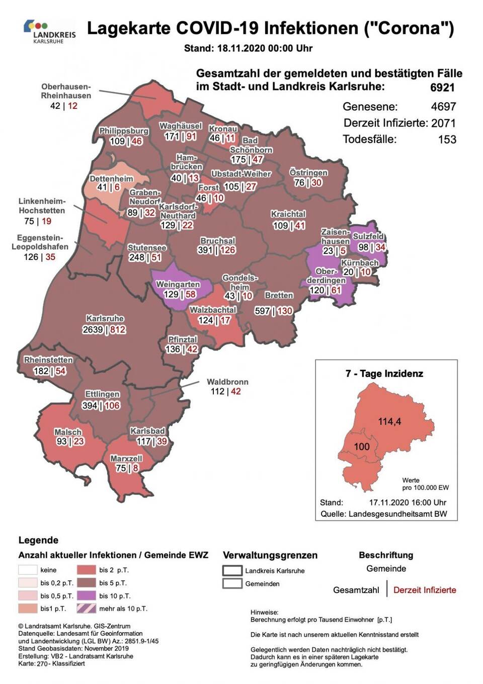 Ebenso wie am Vortag meldet das für den Stadt- und Landkreis Karlsruhe zuständige Gesundheitsamt am Mittwoch vier weitere Todesfälle im Zusammenhang mit Corona. Die Zahl steigt damit auf 153. Dem Tagesbericht ist außerdem zu entnehmen, dass 64 Neuinfektionen hinzugekommen sind und 4697 Personen derzeit wieder als genesen gelten. Das sind 11 Personen mehr als noch am Dienstag. Und außerdem: Seit Beginn der Pandemie haben sich damit insgesamt 6921 Personen im Stadt- und Landkreis Karlsruhe nachweislich mit dem Coronavirus infiziert (Stand: 18. November, 0 Uhr). Derzeit sind 2071 Fälle akut.