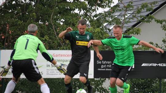 Dass die AH-Mannschaft des VfB beim 20-minütigen Spiel gegen die ehemaligen Bundesliga-Profis erwartungsgemäß mit 0:7 vom Platz gefegt wurden, stimmt hier keinen traurig. „Das ist ein absolutes Highlight“, sagt Uwe Ponzelar, der den Kick vom Spielfeldrand verfolgt. Er selbst ist auch schon umgezogen. Trikot, Schuhe, Torwarthandschuhe. Zusammen mit 16 anderen Gladbach-Fans aus der Region darf der Arnbacher Keeper im Anschluss auf dem Platz gegen seine Idole antreten.