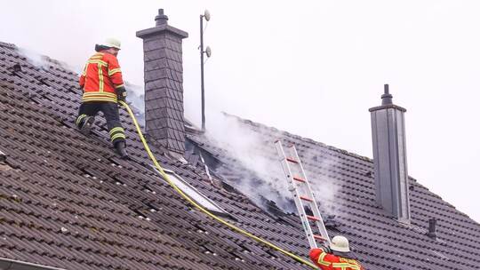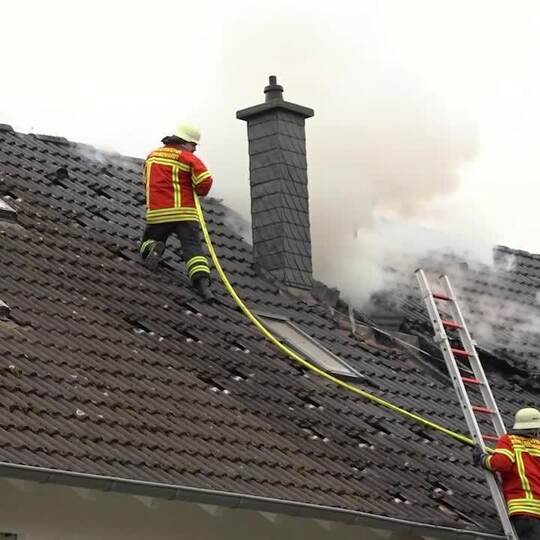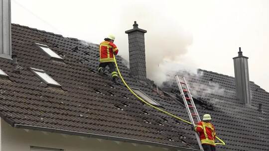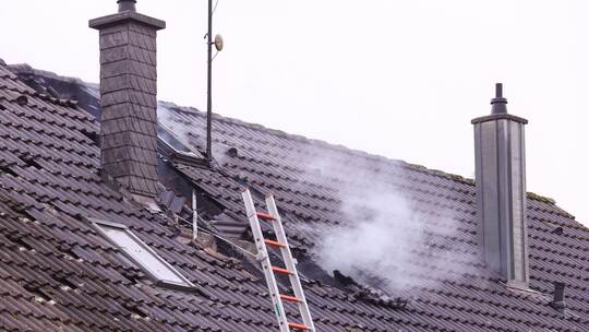 Vor Ort ist dichter Rauch zu sehen, der aus dem Gebäude dringt. Laut Einsatzkräften soll sich das Feuer im Bereich einer Photovoltaikanlage entzündet haben. Das Feuer griff dann auf den gesamten Dachstuhl über und der Qualm zog auf zwei Nachbargebäude.