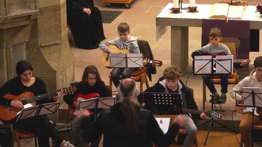 Königsbach-Stein. Als die Kirchenglocken langsam verstummen, ist Roman Rothen bereits an das Dirigentenpult getreten, das im Mittelgang steht. Als er ihnen das Zeichen dafür gibt, fangen die Musiker vor ihm an zu spielen. Auf ihren Gitarren und Querflöten bringen sie am Mittwochabend in der Steiner Stephanuskirche ein Weihnachtslied nach dem anderen zum Vortrag.