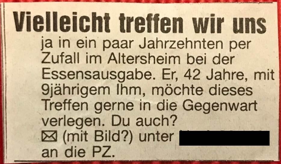 Es war die eine Anzeige, die Brigitte Popps Aufmerksamkeit erweckt hatte. Sie hatte sie ausgeschnitten. So lag sie seit einigen Wochen auf der Eckbank, immer in ihrem Sichtfeld – bis sich Brigitte ein Herz fasste und antwortete. Denn „der 42-jährige Er“ hatte es ihr angetan. „In der Essensausgabe im Altersheim“, das wäre wohl ein paar Jahrzehnte zu spät. So begann sie am 8. September 1996 ihr Antwortschreiben an Michael Schiffmacher. Er meldete sich am 13. September. Nach dem ersten Telefonat trafen sie sich am 14. September um 20 Uhr vor dem unteren Eingang der PZ-Anzeigenabteilung, weil das der einzig richtige Treffpunkt für ein erstes Date gewesen sei.