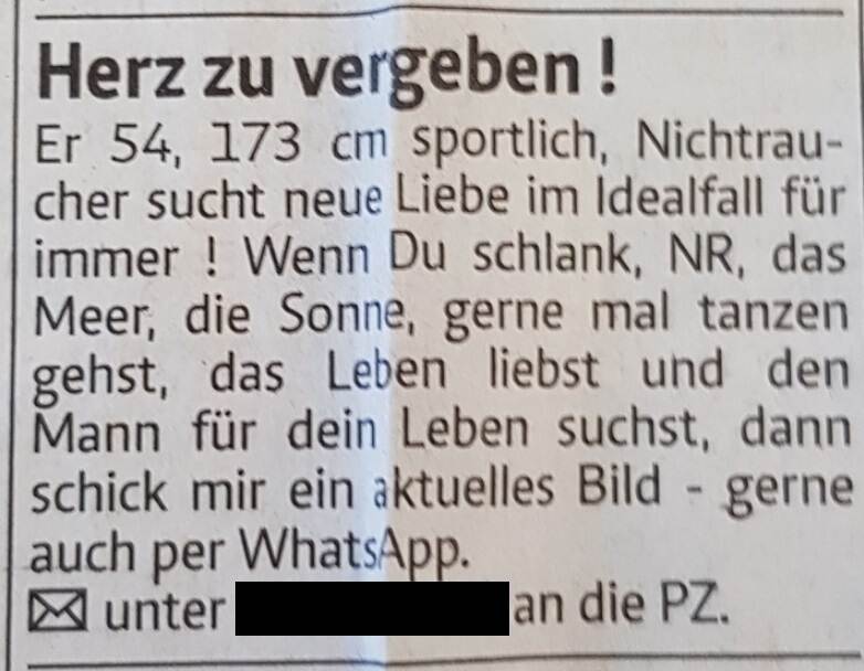 Eine Anzeige unter der Rubrik „Partnersuche“ am 16. Mai 2018 sei ihr besonders ins Auge gefallen, sagt Susanne. „Er sucht Sie, im Idealfall für immer“, tanze gern, liebe die Sonne, das Meer und das Leben. „Genau meine Interessen“, erzählt sie. Sie habe deshalb auf die Anzeige geantwortet. Als „Er“, Jürgen, sich dann meldete, haben sich die beiden noch am selben Abend getroffen und über dies und das geredet. Am nächsten Tag machten sie einen gemeinsamen Spaziergang. Seitdem sind sie ein Paar.