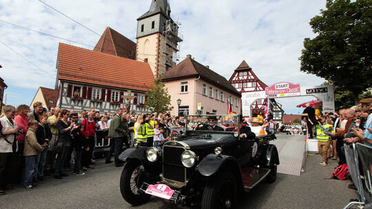 Begeisterte Zuschauer bewundern die Oldtimer der Tiefenbronn Classic. Walter Röhrl macht sich als erster auf die Fahrt nach Bad Liebenzell.