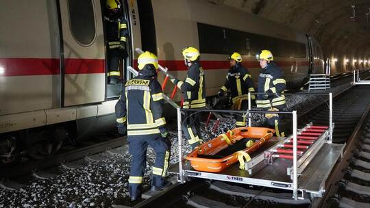 Illingen. Ratternd und rasselnd fährt das Stahlgestell bei dieser Übung die Gleise entlang, immer weiter bis zu dem Bereich, in dem eine Türe geöffnet ist. Es handelt sich um eine sogenannte Rettungslore, die zum Abtransport der Menschen dient, die die Einsatzkräfte kurz zuvor aus dem Inneren des Zugs befreit haben. Außerhalb von Illingen steht die eine Hälfte des Intercity-Expresses (ICE) im Burgbergtunnel, die andere davor in der prallen Sonne. Überall sind Ehrenamtliche der Feuerwehr, des Roten Kreuzes und des Technischen Hilfswerks im Einsatz, auch an den Gleisen und an dem Hang, der neben dem Tunnel in die Höhe ragt. Was auf den ersten Blick aussieht wie ein Katastrophenszenario, ist zum Glück nur eine großangelegte Übung, organisiert vom Sachgebiet Bevölkerungsschutz des Landratsamts.
