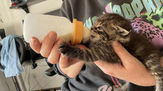Birkenfeld. Birkenfeld/Kreis Calw. Laut maunzend klettert das kleine Katzenbaby am Gitter hoch. Es ist das Letzte der acht Kitten, die gerade von Almut Büchert gefüttert werden. Diese hat gerade ein Geschwisterchen auf dem Arm und gibt ihm eine Flasche mit Kittenmilch. Und das kleine Kätzchen im Laufstall schreit, um zu zeigen, dass es auch großen Hunger hat. Nur wenig später ist sein Geschwisterchen fertig mit Trinken, Büchert legt es in eine große Katzenbox zu den anderen sechs Kitten und nimmt das Achte auf den Arm.