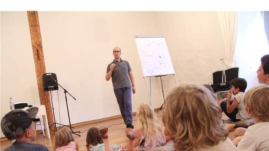 Neuenbürg. Der Kinderbuchautor Ingo Siegner begeistert im Schloss Neuenbürg. Dort erzählt, zeichnet und liest der Erfinder des Feuerdrachen aus seinem neuen Buch - und bewies dabei auch Qualitäten als Rocker.