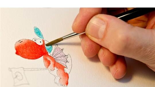 Eine Nase, freundliche Augen und ein gezackter Schwanz: Fertig war der kleine Drache. Doch wie soll er sein? „Ich habe überlegt, dass er gerne Musik hört“, erzählte Ingo Siegner, rockte kurz wie ein Gitarrist und zeichnete dem Helden auf der Staffelei ein paar Kopfhörer an. Eine Schale mit Obst gab ihm vor Jahren die Idee, ihn Apfel oder besser Banane zu nennen. Am Ende wurde es der „kleine Drache Kokosnuss“, über den der Erfolgs-Autor und Illustrator inzwischen 27 Abenteuergeschichten verfasst und neun Millionen Bücher verkauft hat. Im Rahmen des Programms zur aktuellen Ausstellung „Faszination Drachen – Mythen, Märchen, Heldensagen“, bei der Originalillustrationen des Autors zu sehen sind, begeisterte der 53-Jährige rund 50 Besucher im Schloss Neuenbürg.