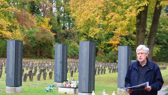 Für die schweigende Besuchergruppe geht es in den abgedunkelten, kühlen Holzkubus zur nächsten Konfrontation mit der Historie, wo eine eigens erstellte audiovisuelle Medieninstallation mit Originaldokumenten und Zitaten die schier unvorstellbaren Zustände untermauert. Weiter geht es zum Luftschutzstollen der SS-Wachmannschaften. Der Abschluss führt auf den KZ-Friedhof. Ein würdevoller Ort des Gedenkens mit Erinnerungsstein, der 1958 als letzte Ruhestätte für 1267 Opfer auf dem einstigen Gelände des Lagers seinen Platz fand. Auf vier Stelen finden sich die Namen fast aller hier Verstorbenen, als Mahnung und Erinnerung.