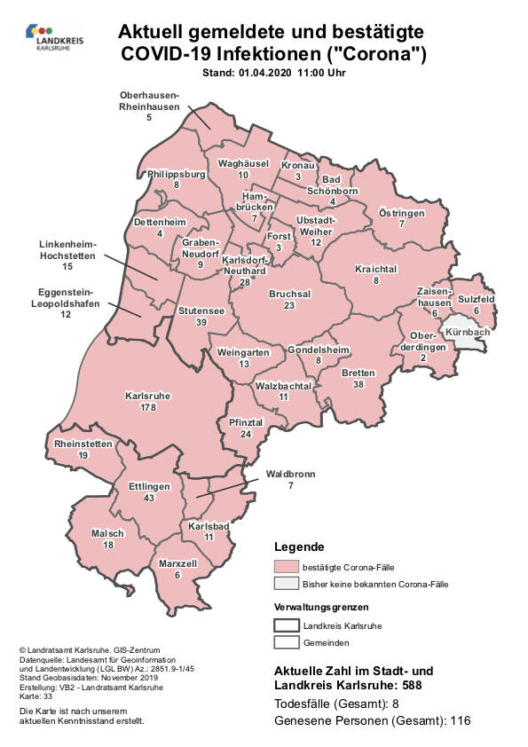 Der Stadt- und Landkreis Karlsruhe listet 116 genesene Personen auf. Mit den zwei neuen Todesfällen haben die Karlsruher nun insgesamt 8 Corona-Tote.