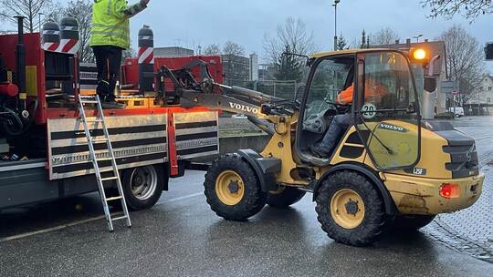 Mühlacker. Die Wolken über Mühlacker hängen tief an diesem Dienstagmorgen, es regnet ununterbrochen. Die Temperaturen bewegen sich zwar knapp über dem Gefrierpunkt, es dauert aber dennoch nicht lange, bis sich die Kälte bemerkbar macht. Eine Ausrede für die zwei Männer vom Mühlacker Bauhof ist das dennoch nicht. Um Punkt 8 Uhr an diesem Dienstag treffen sie mit schwerem Gerät auf dem Kelterplatz ein, um den bevorstehenden Weihnachtsmarkt bestmöglich abzusichern.