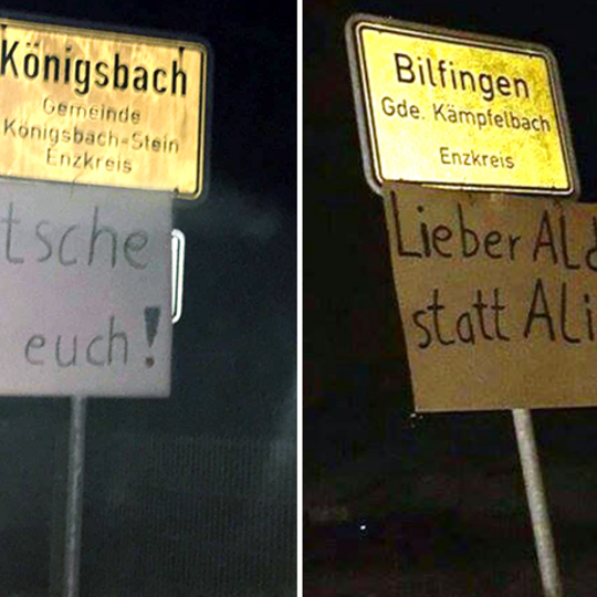 „Deutsche wehrt euch!“ hatte im Januar 2016 ein unbekannter Zeitgenosse mit einem schwarzen Edding-Stift auf braunem Pappkarton geschrieben und mit Kabelbinder an ein Königsbacher Ortsschild gebunden. Auf Pappkartons an anderen Ortsschildern in Königsbach-Stein, Bilfingen, Ispringen, Ersingen und Eisingen standen andere Hetzparolen. Im Oktober 2015 hing schon einmal ein ähnliches Schild am Ortseingang von Ersingen.