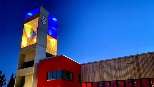 Als Zeichen für den Frieden und Symbol der Solidarität mit den Menschen in der Ukraine leuchtet seit Montagabend der Übungsturm des Oberderdinger Feuerwehrhauses in den Farben der Ukraine, gelb und blau. Angesichts der dramatischen Lage unterstützt die Feuerwehr Oberderdingen die Hilfsaktion durch die Bereitstellung geeigneter, dringend benötigter Ausrüstungsgegenstände für den Katastrophenschutz in der Ukraine. Darauf hat der Landesfeuerwehrverband Baden-Württemberg hingewiesen.