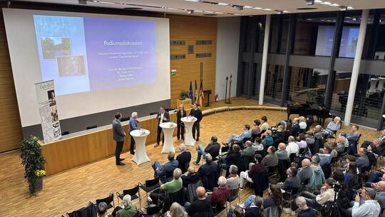 Der Geschäftsführer des evangelischen Erwachsenenbildung Tobias Götz (von links), der Nagolder Arzt Dr. Fredy Kahn, Schuldekan Thorsten Trautwein, Historikerin Prof. Dr. Benigna Schönhagen und der Vorsitzende des Dachverbandes der Jugendgemeinderäte Jonas Dehmel sprechen über die deutsche Erinnerungskultur.