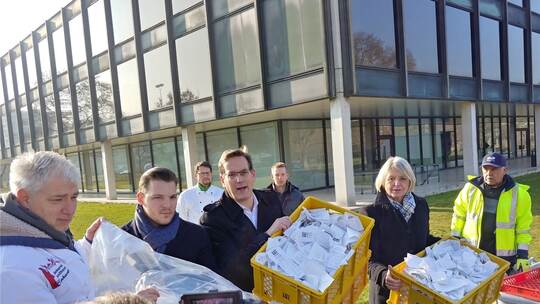 Sein Hauptargument: Schon die jetzt geforderten Kassensysteme machten jeden Verkauf überprüfbar, wenn man Steuerbetrug verhindern möchte. Die Bäcker hat er dabei auf seiner Seite. Höchstens ein Prozent aller Kunden wolle den Beleg auch mitnehmen, sagt der Pforzheimer Bäcker und FDP-Politiker Janis Wiskandt. Die Folge sind bergeweise Bonausdrucke für den Müll. Rund 20.000 hat Wiskandt den Landtagsabgeordneten Erik Schweickert und Hans-Ulrich Rülke mit auf den Weg vors Parlament in Stuttgart gegeben. Platz genug war in dem Entsorgungsfahrzeug der Firma Vanni und Didicher. Die Bäcker Meeh in Wiernsheim, Jäkle in Friolzheim, Reinhardt in Knittlingen, Burkert in Ötisheim und Katz in Vaihingen steuerten weitere Schnipsel bei. Alleine bei Katz lud Schweickert Säcke mit einer viertel Million Bons auf den Laster. Mit Reinhardt und Oliver Grimm von Vanni und Didicher warb er für seine Argumente. Der Ausschuss gab ihm mehrheitlich einen Korb.