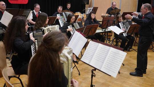 Kämpfelbach. Wo eben noch filigrane Melodien zart vor sich hingeflossen sind, bricht ein paar Sekunden später ein Sturm los: tosend, brausend und wuchtig. Auf majestätische Erhabenheit folgt wildes Durcheinander, auf elegante Zurückhaltung ein entschlossenes Vorpreschen. Stilsicher manövrieren sich die Musiker durch die Tempo- und Taktwechsel. Das Stück mit dem Titel „La Storia“ ist nicht das einzige, aber eines der eindrucksvollsten, mit dem die Mitglieder des Ersinger Akkordeon-Spielrings ihr Können unter Beweis stellen.