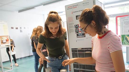 Auch Nathalie (14), Anelle (13) und Hannah (14) schauen sich die Ausstellung an. Die Schülerinnen sind gut in Mathe, Physik und Informatik und werden ab dem kommenden Schuljahr das neu eingeführte Fach IMP besuchen, das alle drei Bereiche verbindet. Die Schülerinnen haben Spaß am Programmieren und am Lösen mathematischer Probleme. Davon wird es in dem neuen Fach laut Miriam Klein in Zukunft mehr als genug geben. Schließlich stünden praxisnahes, anschauliches Lernen genauso im Mittelpunkt wie komplexe Sachverhalte.