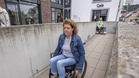 Niefern-Öschelbronn. Wer in Nieferns Ortsmitte in Geschäfte, Banken oder die Post geht, hat es einfach. An der Hauptstraße aufgereiht, sind die Läden alle leicht erreichbar. Viele Parkplätze auf beiden Seiten und kurze Wege für Fußgänger. Doch Menschen mit Gehbehinderung müssen im Ortskern einige Hindernisse überwinden – auf den ersten Blick für Fußgänger oft nicht sichtbar, wie ein rund 90-minütiger Test mit der Rollstuhlfahrerin Sabine Meier aus Niefern zeigt. Bürgermeisterin Birgit Förster und Daniela Krause, die im Amt für Personal und Bildung für Inklusionsthemen zuständig ist, begleiten sie.