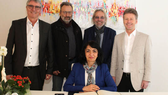 Hoher Besuch in Illingen: Landtagspräsidentin Muhterem Aras trägt sich ins Goldene Buch der Gemeinde ein