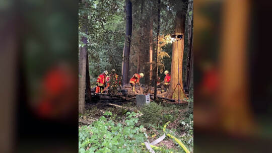 Wie die Polizei vor Ort erklärt, wurden Scheinwerfer im Wald aufgestellt, um die Sicht zu erleichtern. Gefahr habe zu keinem Zeitpunkt bestanden.
