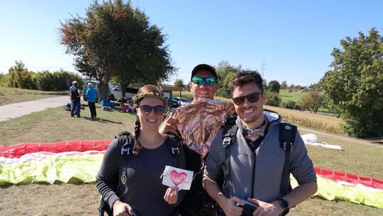 Björn Berle hebt seit 27 Jahren ab. Der Eisinger ist Gleitschirmflieger und stellvertretender Vorstand im Gleitschirmclub Kraichtal. Seine Leidenschaft gibt der in Pforzheim arbeitende Polizist auch beim German-Cup der Heißluftballone weiter, wenn er als Pilot für Tandemflüge unterwegs ist. Oft fliegt Berle einträchtig mit Segelflugzeugen, Drachenfliegern und Greifvögeln umher. Nun kam es allerdings hoch über Gölshausen zu einer Begegnung der seltenen Art. Björn Berle startet zu einem Flug über die Region vom Kraichtaler Stadtteil Oberacker aus. Dort lassen sich die Piloten des Gleitschirmclubs bei schönem Wetter an der Seilwinde in die Höhe ziehen, um dann nach Aufwinden zu suchen. Tief unten am Boden geben sich Sara und Alexander Thau zur gleichen Zeit und nur rund zehn Kilometer entfernt das Ja-Wort.