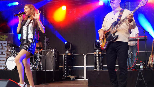 Mühlacker. Was für ein Repertoire! Abwechslung ist beim breit gefächerten Line Up der Band „Mocca 4“ schlicht Trumpf: Die bei den „SommerevENZ“ in Mühlacker dargebotenen Stücke reichen von Shocking Blues Evergreen „Venus“ (1969) bis zu Miley Cyrus‘ aktuellem Song „Flowers“ (2023), bei dem die Stimme der zierlichen Sängerin Bea Reiling beherzt in überraschende Tiefen vorstößt. Eigens für den Open-Air-Auftritt an der stillen Enz hat sich die Pforzheimer Band mit dem Keyboarder Jörg Richter aus Heidelberg verstärkt, der seine Stimme beispielsweise dem einzigen Hit der Texanischen Alternative Rock Band Deep Blue Something – „Breakfast At Tiffany’s“ – leiht und wenig später mit einer Interpretation des zeitlosen Reggae „I Shot The Sheriff“ überrascht, die er eher an Claptons Version als an Marleys Original orientiert.