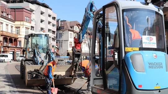 Bad Wildbad. Die ungewöhnliche Ruhe in der Bad Wildbader König-Karl-Straße nutzt die Albtal-Verkehrs-Gesellschaft (AVG), um den Schienenbereich der Enztalbahn zu sanieren. Mit schwerem Gerät arbeiten sich die Männer Stück für Stück vorwärts und tauschen Oberflächen und schadhafte Pflaster aus. Das alles findet bei laufendem Bahnbetrieb statt.