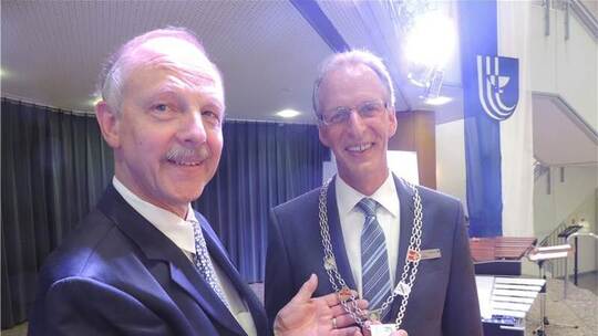 „Ich baue auf die Unterstützung des Gemeinderates mit Rat und Tat, um gemeinsam ein sachgerechtes und zielorientiertes Ergebnis für Karlsbad zu erreichen“, betonte der neue Karlsbader Bürgermeister Jens Timm in seiner Antrittsrede in der Aula des Karlsbader Schulzentrums vor über 200 geladenen Gästen. Vorausgegangen war die offizielle Vereidigung und Verpflichtung durch Bürgermeister-Stellvertreter Peter Kiesinger, die auf der Basis der Gemeindeordnung den Rahmen einer öffentlichen Gemeinderatssitzung erforderte. Anschließend überreichte der scheidende Bürgermeister Rudi Knodel seinem Nachfolger die Amtskette.