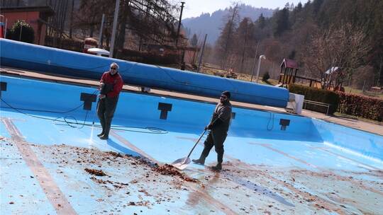 Während das Becken mit Hochdruckreinigern gesäubert wird, bessern Mitarbeiter des Bauhofs das Dach über den Duschen aus, dessen Tragkonstruktion über die kalten Monate gelitten hat.