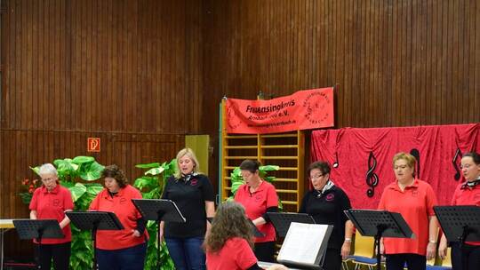 Der Andrang gab ihr Recht. In der Arnbachhalle fand das Zusammentreffen statt, bei dem auch die Chorgemeinschaft Neuenbürg, der Musikverein Kleinsteinbach, der Flutlichtchor Dennach und weitere Gruppen aus der Region unter dem Motto „Chöre singen ihre Lieblingslieder“ auftraten. Für das leibliche Wohl der Gäste sorgte der Frauensingkreis selbst, was für die Chormitglieder nicht ohne Stress von der Hand ging. „Dennoch freut es uns, unsere Gäste persönlich bedienen und mit ihnen ins Gespräch kommen zu können“, so Kappler. Ein weiteres Glanzlicht war Bauchredner Klaus Schlotterer mit Puppe Lucie, der die Gäste zum Lachen brachte.