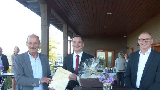 Zusammen mit den Glückwünschen der Stadt-Mitarbeiter fanden dann drei Flaschen eines besonderen Rotweins – „Wir wissen, Sie trinken gerne einen Roten“ – den Weg zu Mack, der zusammen mit Ehefrau Michaela auf den Sommerberg gekommen war. Bei den beiden stehe die Silberhochzeit ja noch bevor, machte man dem Paar das nächste Ziel deutlich.
