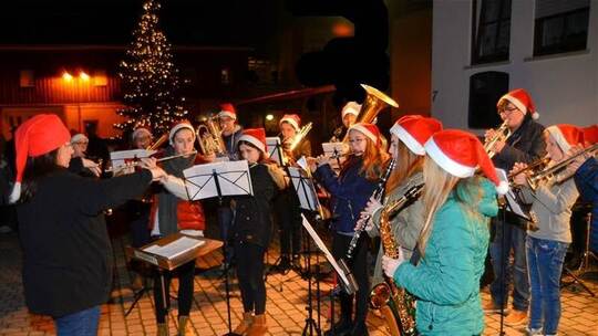 Zum Auftakt hatte der Schülerchor unter der Leitung von Vizedirigentin Cornelia Schmid mit Querflöten und Klarinetten den Vortritt. „Alle Jahre wieder“, „Ihr Kinderlein kommet“ oder „Lasst uns froh und munter sein“ und „In der Weihnachtsbäckerei“ spielten sie zur Einstimmung. Das Jugendorchester, dirigiert von Isabell Liebich, präsentierte einige der bekanntesten Weihnachtslieder, wie „O Tannenbaum“ von Melchior Frank, „Alle Jahre wieder, kommt das Christuskind“ von Friedrich Silcher oder Georg Friedrich Händels „Tochter Zion“. Schließlich hatte das große Blasorchester unter der Leitung von Alexander Weber seinen Auftritt, zunächst mit dem englischen Song „Winter Wonderland“ von Felix Bernard. „Es ist ein Ros’ entsprungen“ und viele andere Lieder in einem großen Weihnachtsmedley rundeten die adventliche Abendmusik unterm Tannenbaum ab. Auch der Bratenduft war auf dem Brunnenplatz verführerisch. Nach dem Konzert konnten sich die abendlichen Gäste mit Leckerem vom Grill, mit der traditionellen Kuttelsuppe und mit Glühwein aufwärmen und stärken. msch