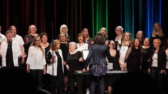 Remchingen. Mitreißender Gesang trifft auf humorvolle Einlagen, handgemachte Musik auf starke Stimmen, Johnny Cash auf John Legend, Rock auf Pop, die Ballade auf den Discokracher – und alles passt perfekt zusammen. Es ist eine fein austarierte, wohl dosierte Mischung verschiedener Genres und Unterhaltungsformen, die die „Voices in motion“ am Samstagabend zusammen mit Comedienne Sigi Gall und einer vierköpfigen Liveband auf die Bühne bringen. Eine Mischung, die beim Publikum in der Remchinger Kulturhalle bestens ankommt: Die Reihen sind gut gefüllt, die Besucher bestens gelaunt und die Beifallstürme am Ende so laut, dass eine Zugabe gewährt werden muss.
