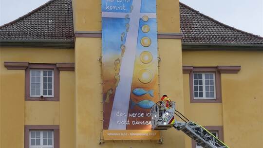 Karlsbad-Langensteinbach. Es ist ein Projekt, das innerhalb der Evangelischen Landeskirche Baden ein Alleinstellungsmerkmal genießt und auf deren Homepage eine weite Verbreitung findet. Seit 2000 ziert die Jahreslosung als großflächiges Kunstobjekt den über 37 Meter hohen Kirchturm der evangelischen Ludwigskirche am Doppelkreisel in Langensteinbach. Die Jahreslosung wird seit dem Jahre 1970 von der Ökumenischen Arbeitsgemeinschaft für Bibellesen als bundesweites ökumenisches Zitat ausgewählt. So auch die Losung 2022: „Jesus Christus spricht: Wer zu mir kommt, den werde ich nicht abweisen“ (Johannesevangelium 6,37).