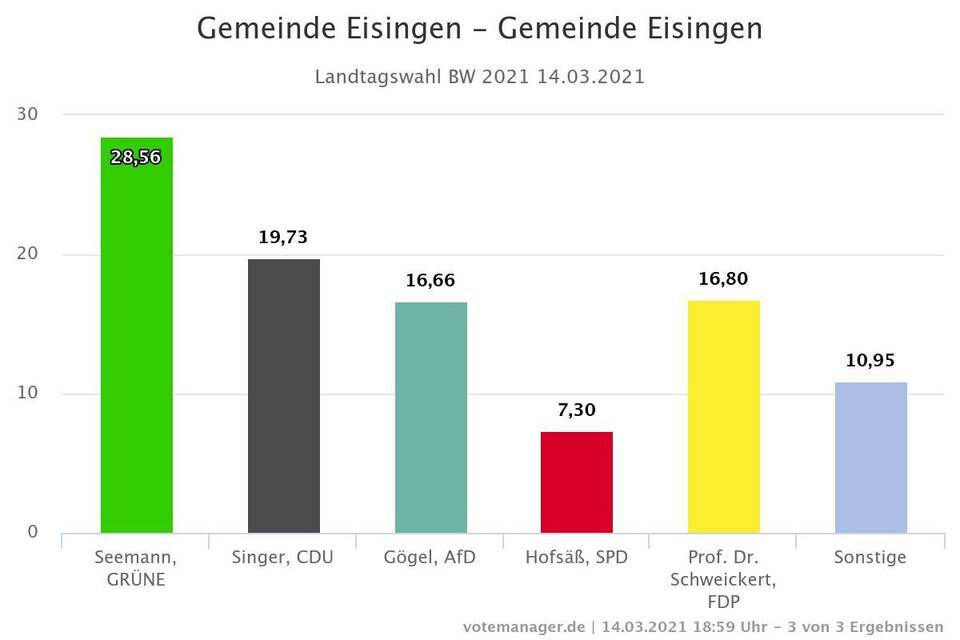 Stärkste Kraft in Eisingen waren 2021 die Grünen mit Stefanie Seemann, die 28,56 Prozent der Stimmen auf sich vereinen konnte. Damit lagen sie deutlich vor der Konkurrenz und setzten ein klares Zeichen in der Gemeinde. Auf Platz zwei folgte die CDU: Phillippe A. Singer erreichte 19,73 Prozent und positionierte sich als wichtigste Verfolgerin.