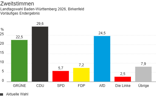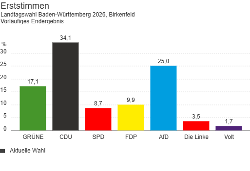 Bei der Landtagswahl in Baden-Württemberg am 8. März 2026 hat die CDU in der Gemeinde Birkenfeld die meisten Stimmen erhalten. CDU-Kandidat Andreas Renner kam bei den Erststimmen auf 34,1 Prozent und lag damit deutlich vor seinen Mitbewerbern. Auch bei den Zweitstimmen erreichte die CDU mit 29,6 Prozent den höchsten Anteil und verzeichnete dabei einen Zuwachs von 7,1 Prozentpunkten.