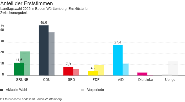 Enzklösterle. Bei der Landtagswahl in der Gemeinde Enzklösterle liegt bei den Erststimmen der CDU-Kandidat Carl Christian Hirsch deutlich vorne. Er erhält 319 Stimmen (45,0 Prozent). Dahinter folgt Miguel Klauß (AfD) mit 194 Stimmen (27,4 Prozent). Fynn Rubehn (Grüne) kommt auf 82 Stimmen (11,6 Prozent).