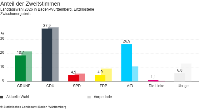 Bei den Zweitstimmen liegt ebenfalls die CDU vorne mit 271 Stimmen (37,9 Prozent). Es folgen die AfD mit 192 Stimmen (26,9 Prozent) und die Grünen mit 134 Stimmen (18,7 Prozent). Dahinter liegen FDP mit 35 Stimmen (4,9 Prozent), SPD mit 32 Stimmen (4,5 Prozent) und Die Linke mit 8 Stimmen (1,1 Prozent).