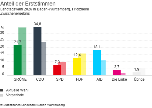 Friolzheim. Bei der Landtagswahl in der Gemeinde Friolzheim liegt bei den Erststimmen der CDU-Kandidat Nico Gunzelmann vorne. Er erhält 729 Stimmen (34,8 Prozent). Dahinter folgt Stefanie Seemann (Grüne) mit 455 Stimmen (21,7 Prozent). Alexander Steblau (AfD) kommt auf 379 Stimmen (18,1 Prozent).