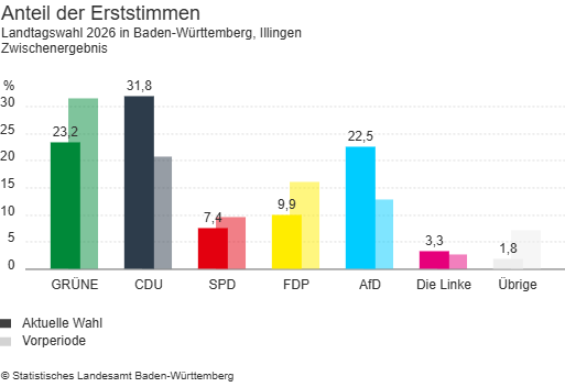 Illimgen. Bei der Landtagswahl in der Gemeinde Illingen liegt bei den Erststimmen der CDU-Kandidat Nico Gunzelmann vorne. Er erhält 1.272 Stimmen (31,9 Prozent). Dahinter folgt Stefanie Seemann (Grüne) mit 928 Stimmen (23,2 Prozent). Alexander Steblau (AfD) kommt auf 899 Stimmen (22,5 Prozent).